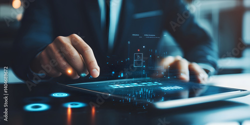Future of Technology: Hand Grasping Tablet with AI, Finance & Cybersecurity Elements