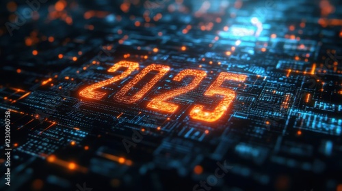 Futuristic 2025 Digital Code New Year Tech Background Abstract Design Orange Glow Circuit Board
