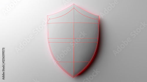 Futuristic 3D abstract metallic shield with glowing red grid lines on a light grey background symbolizing cybersecurity, digital protection, internet safety, network defense, and online security