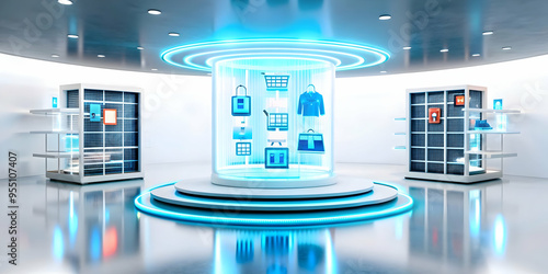 Futuristic 3D AI Driven Retail Space Background with Digital Price Tags and Interactive Displays - Innovative Design for Cost Management and Transformation in Retail Tech