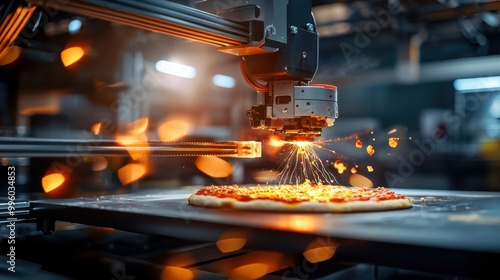 Futuristic 3D Food Printing: Automatic Cheese and Sauce Layering on Pizza Base with Mechanical Arm in Background