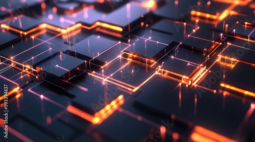 Futuristic 3D geometric shapes arranged in an abstract, interconnected pattern with glowing lines between them