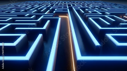 Futuristic 3D Maze with Neon Blue Glow and Intersecting Paths in Abstract Design