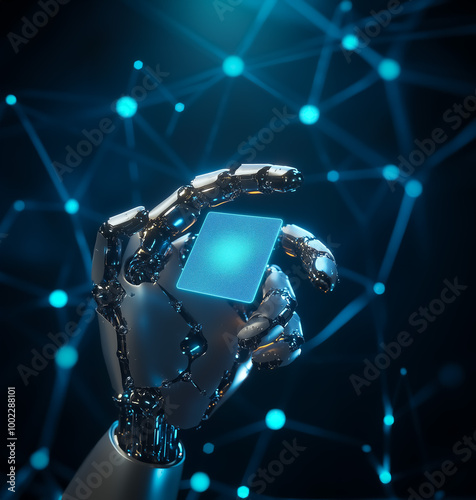 Futuristic 3D rendering of a metallic robotic hand holding a digital object, representing advanced artificial intelligence technology. The scene is illuminated with blue tones and a network of inter