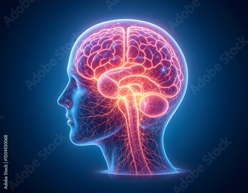 Futuristic 3D Rendering of Human Brain Activity in Female Profile – Transparent Head and Spine Visualizing Neural Network and Central Nervous System in Digital Medical Illustration