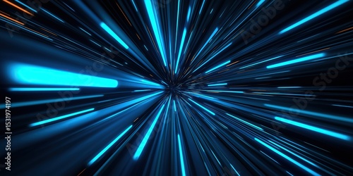 Futuristic 3D rendering of light speed tunnel with glowing blue and orange energy lines in deep space, abstract technology concept for sci-fi business design and digital innovation