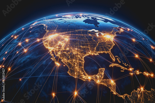 Futuristic 3D Virtual Globe with Glowing Points Illuminating the Americas, Showcasing Connectivity and Technological Advancement in a Sleek Design