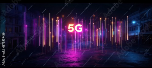 Futuristic Abstract 5G Design with Glowing Neon Lines in Purple Pink Yellow, Modern Minimalistic Aesthetics for Mobile Networks Concept