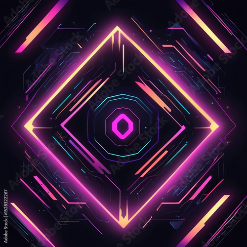 Futuristic abstract art background, glowing geometric forms, neon lighting, dark gradient backdrop, tech-inspired.