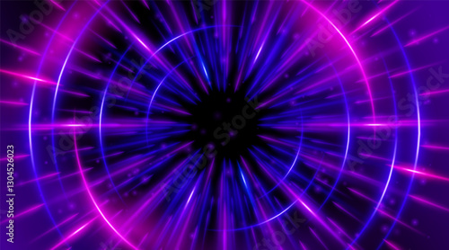 Futuristic abstract background with a radial burst of light and energy, dynamics emanating from the center. Speed. Blue, purple and pink light rays emit and create glowing particle effects.