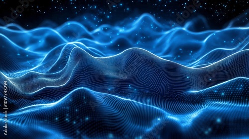 Futuristic abstract blue technology background with digital waves, neural network, cyber computing, and artificial particles.