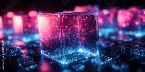 Futuristic Abstract Composition of Transparent Cubes with Soft Blue and Purple Lights on Dark Background