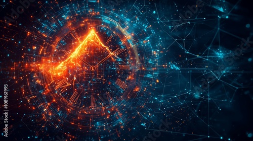 Futuristic Abstract Digital Clock with Glowing Lines and Geometric Shapes in Orange and Blue, Representing Technology, Time, and Data Processing in a Dynamic Environment