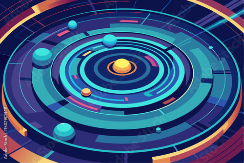Futuristic abstract technology background featuring glowing concentric circles, radial lines, and blue neon dots on a dark gradient backdrop. Ideal for high-tech, data visualization, AI, blockchain, c