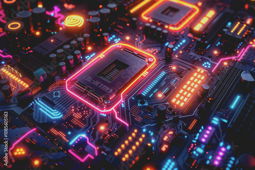 Futuristic advanced technology in bright colors Data flows through the microchip and motherboard.