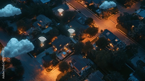Futuristic aerial view of residential area with animated WiFi symbols, cloud integration, and IoT device graphics