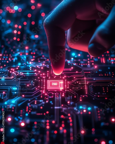 Futuristic AI circuit board in the shape of an electronic PCB symbol, businessman s hand finger touching, illuminated with cyberpunk neon lighting