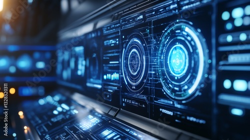 Futuristic AI Control Center with Holographic Screens and Data Displays