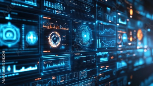 Futuristic AI Control Center with Holographic Screens and Data Displays for Technology Concept Illustration