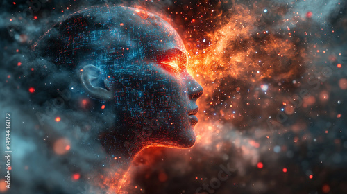 Futuristic AI human face with glowing digital code and cosmic particles in a surreal space scene.