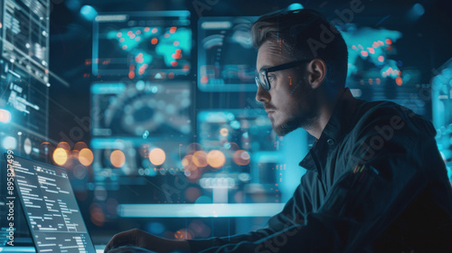 Futuristic AI image creation software on a laptop, man exploring various visual prompts