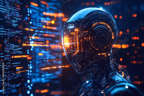 Futuristic ai robot in neon lights exploring advanced digital technology and cybernetic innovations