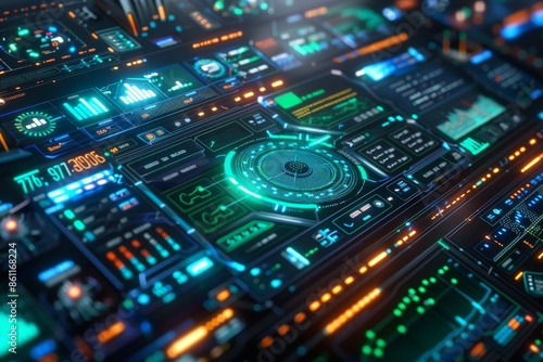 Futuristic AI-driven analytics dashboard, holographic displays, neon blue and green data streams, wide angle
