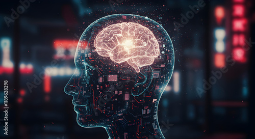 Futuristic AI-Enhanced Human Brain: Digital Visualization of a Cybernetic Head with a Glowing Neural Network and Embedded Circuitry in a High-Tech Urban Environment