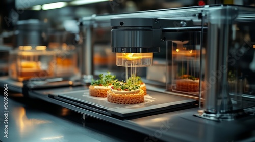 Futuristic AI-powered 3D food printers creating customizable meals on demand: Machines using AI to generate meals based on personal nutritional requirements and taste preferences.