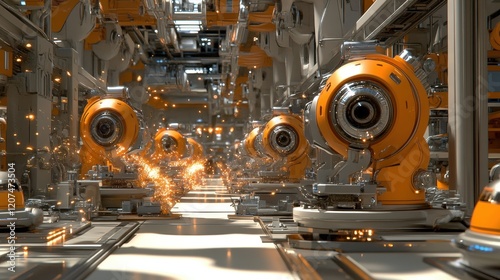 Futuristic Assembly Line with Robots and Sparks in Industrial Setting