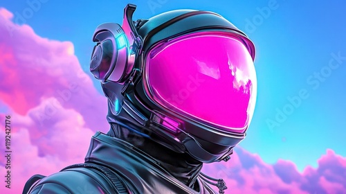 Futuristic Astronaut in Vibrant Universe with Pink Helmet and Clouds