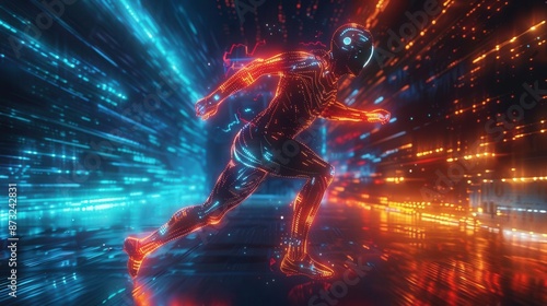 Futuristic athlete running, holographic metrics tracking fitness and heart rate, vibrant colors, medium shot