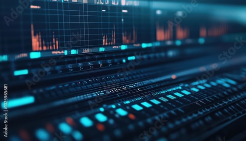 Futuristic audio interface with digital waveforms and vibrant lights on a dark background.