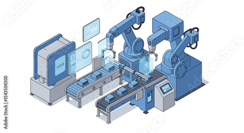 Futuristic automated factory with robotic arm assembly line for industrial technology isometric style vector illustration