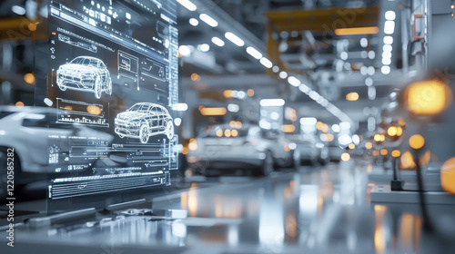 Futuristic automotive design displayed on digital screen in modern factory, showcasing innovation and technology in vehicle manufacturing