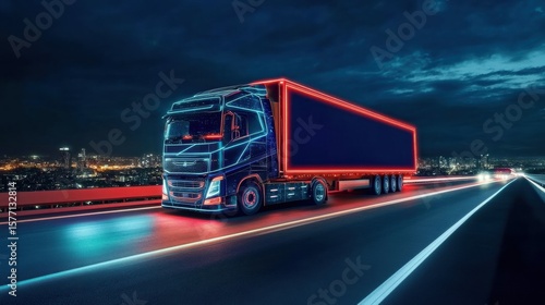 Futuristic Autonomous Truck with Sensor Technology Driving on the Road. Road Sensors Scanning