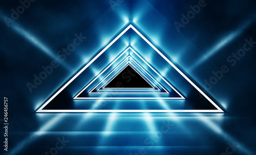 Futuristic background with neon shapes of a triangle, reflection, smoke. Empty tunnel with neon light. 3d illustration