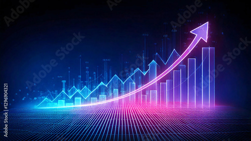 Futuristic Bar Chart with Glowing Growth Arrow and Data Visualization