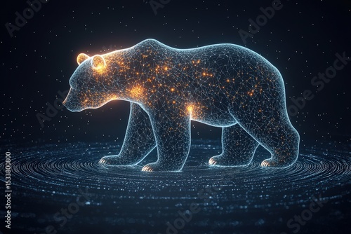 Futuristic bear: neon wireframe with glowing particles in digital universe