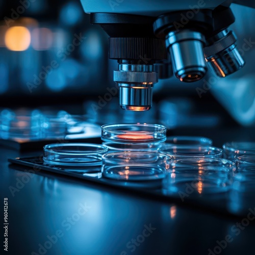 Futuristic biotech lab with rows of petri dishes growing genetically modified organisms under blue light
