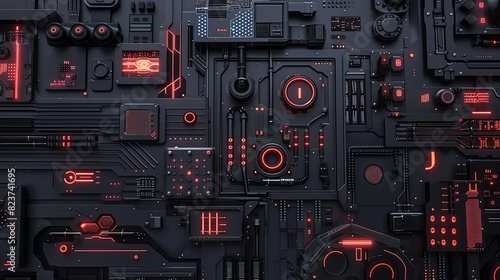 Futuristic black and red technology circuit board background. Abstract high tech digital interface design.