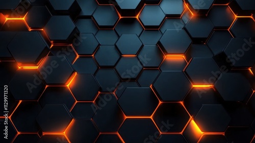 Futuristic Black Hexagonal Wall with Orange Backlighting and Geometric Patterns