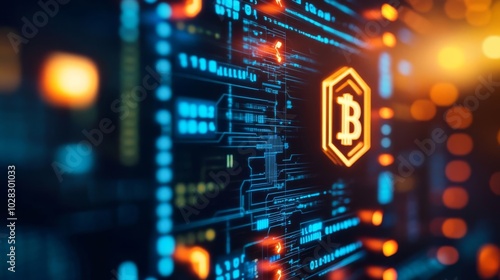 Futuristic blockchain ecosystem, neon lights, dark tech background