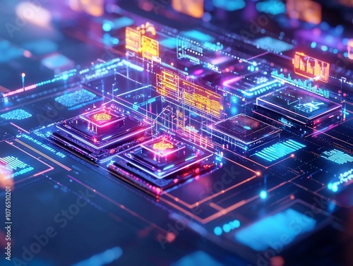 Futuristic Blockchain Powered Marketplace with Glowing Holographic Products for Secure Digital Transactions and Ownership Transfers