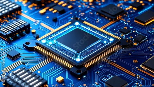 Futuristic blue computer chip and data transmission concept