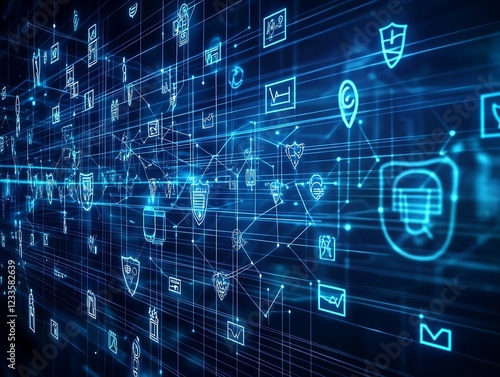 Futuristic Blue Digital Technology Background with Cybersecurity Icons and Connections : Generative AI