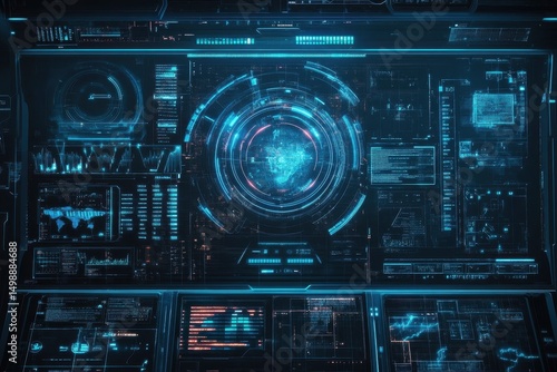 Futuristic blue HUD display showcasing advanced technological interfaces and data analytics in a high-tech environment