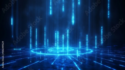 Futuristic blue light beams illuminating a circular floor in a dark space.