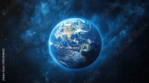 Futuristic Blue Tech Earth in Space with Glowing Stars and Nebulae, Symbolizing Advanced Technology and Innovation