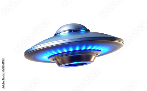 Futuristic blue UFO spaceship with glowing lights and sleek design representing science fiction alien technology and space exploration isolated on clean transparent background in PNG